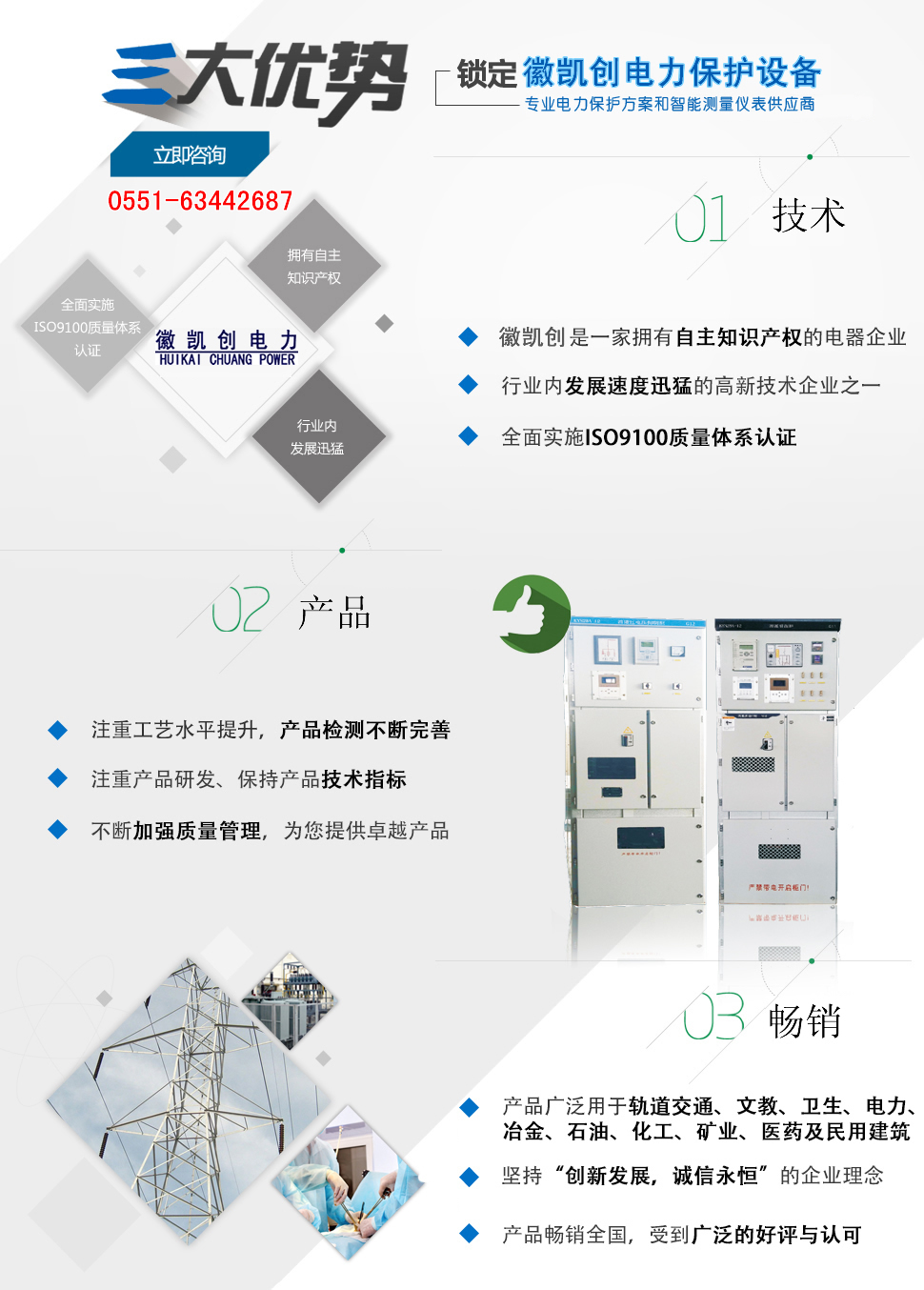 安徽徽凱創電力保護設備有限公司主要從事新型電氣設備、電子設備、智能控制技術的產品研發、生產、銷售。主要產品有:智能型消弧消諧裝置、消諧過電壓抑制柜、 組合式過電壓保護、智能型開關柜智能操控裝置、微機消諧、小電流選線、電弧光保護裝置、智能在線絕緣監測裝置等電氣產品。 產品廣泛用于石化、煤炭、電力、建筑、市政、機場、鐵路、醫院、學校等領域,受到用戶一致好評。